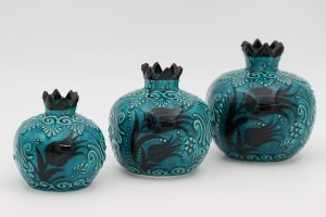 Turkish Ceramic Hand Painted Pomegranate Set of 3 Vase’s In Turquoise Design