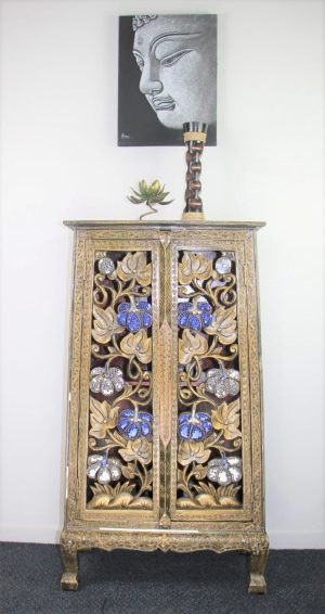 Ornate Hand Carved Cabinet With 4 Cupboards Blue/White Flower Mosaic
