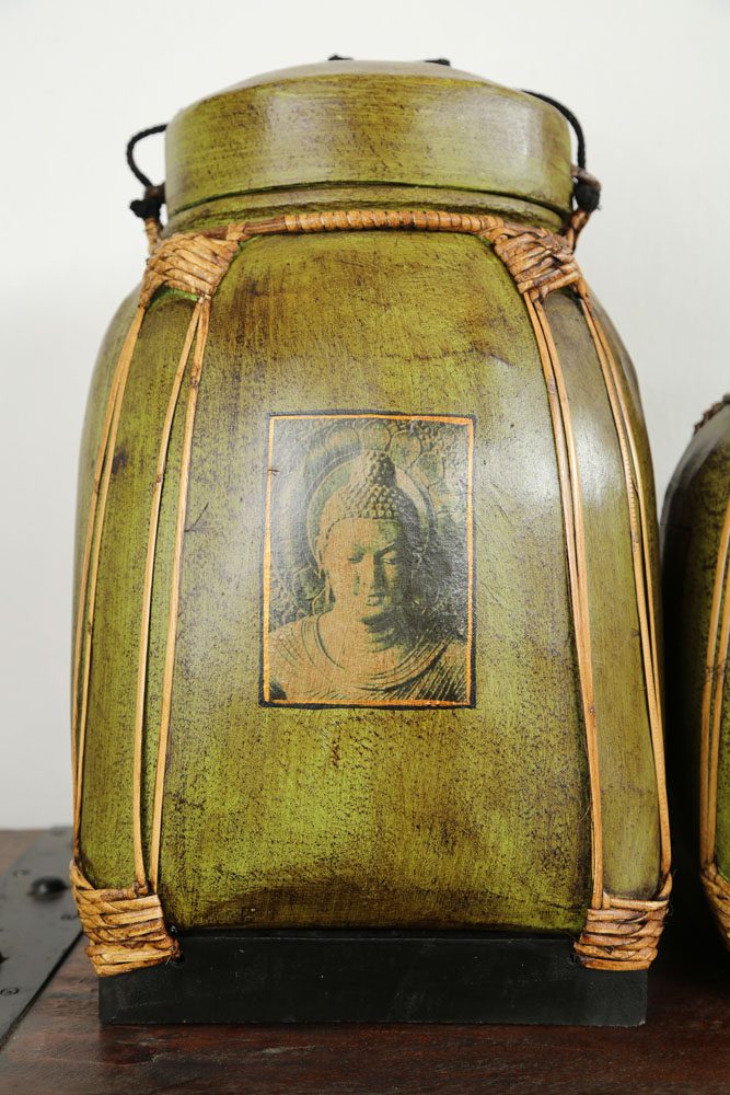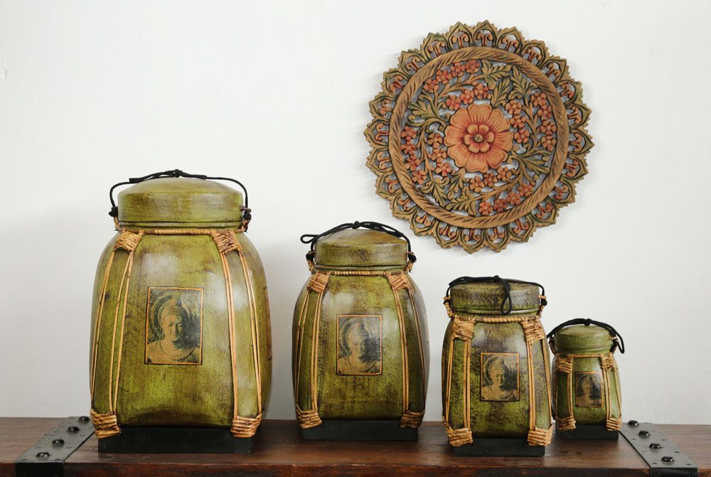 Traditional handmade and painted Rice Baskets, constructed from bamboo. What a unique ornament ! We have these from many sizes and colours the featured one is olive green. So many uses for these gorgeous baskets from cotton wool balls to potato storage. As our products are all hand made there may be slight variances. Dimensions Approx. 16 x 16 x 47 cm tall