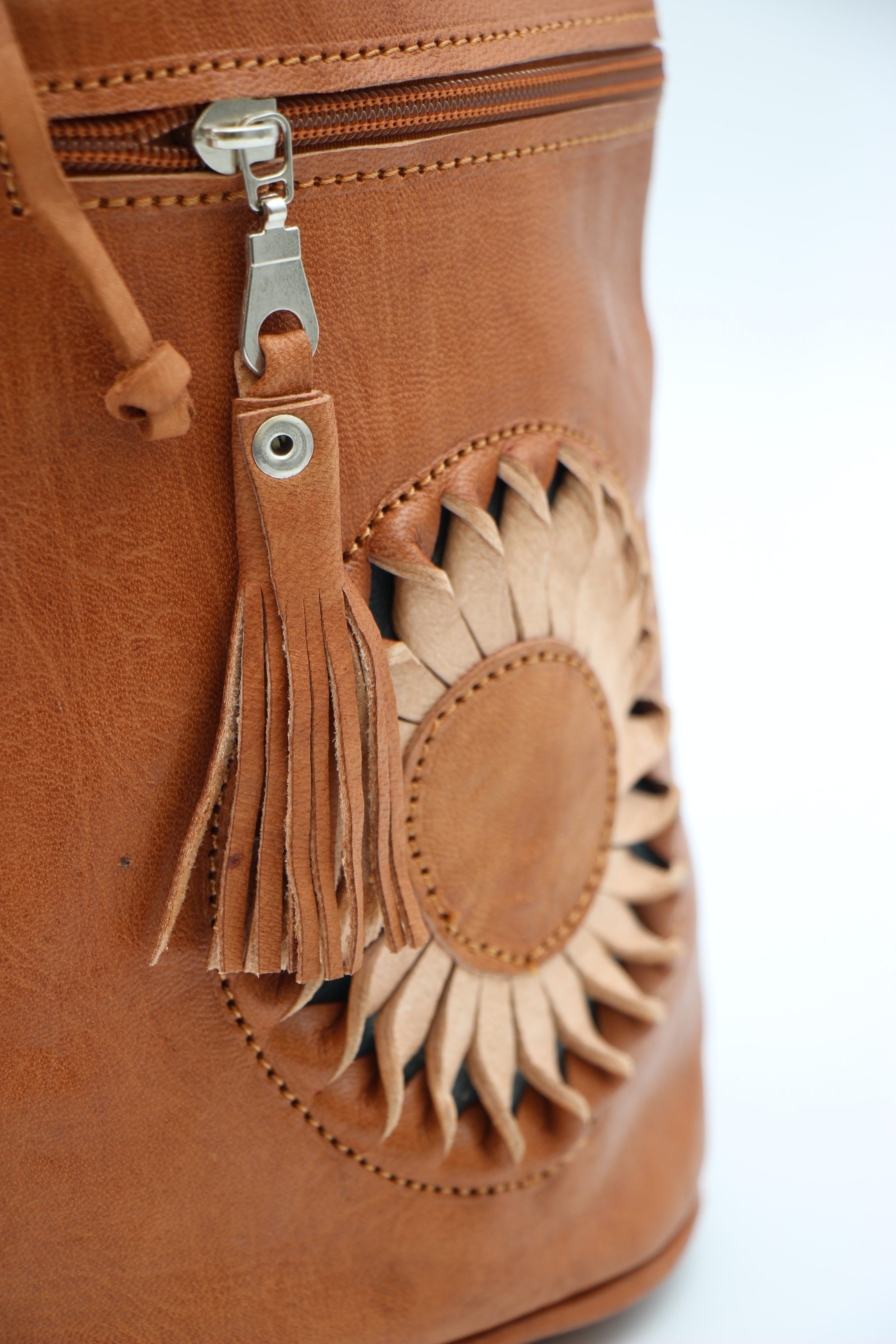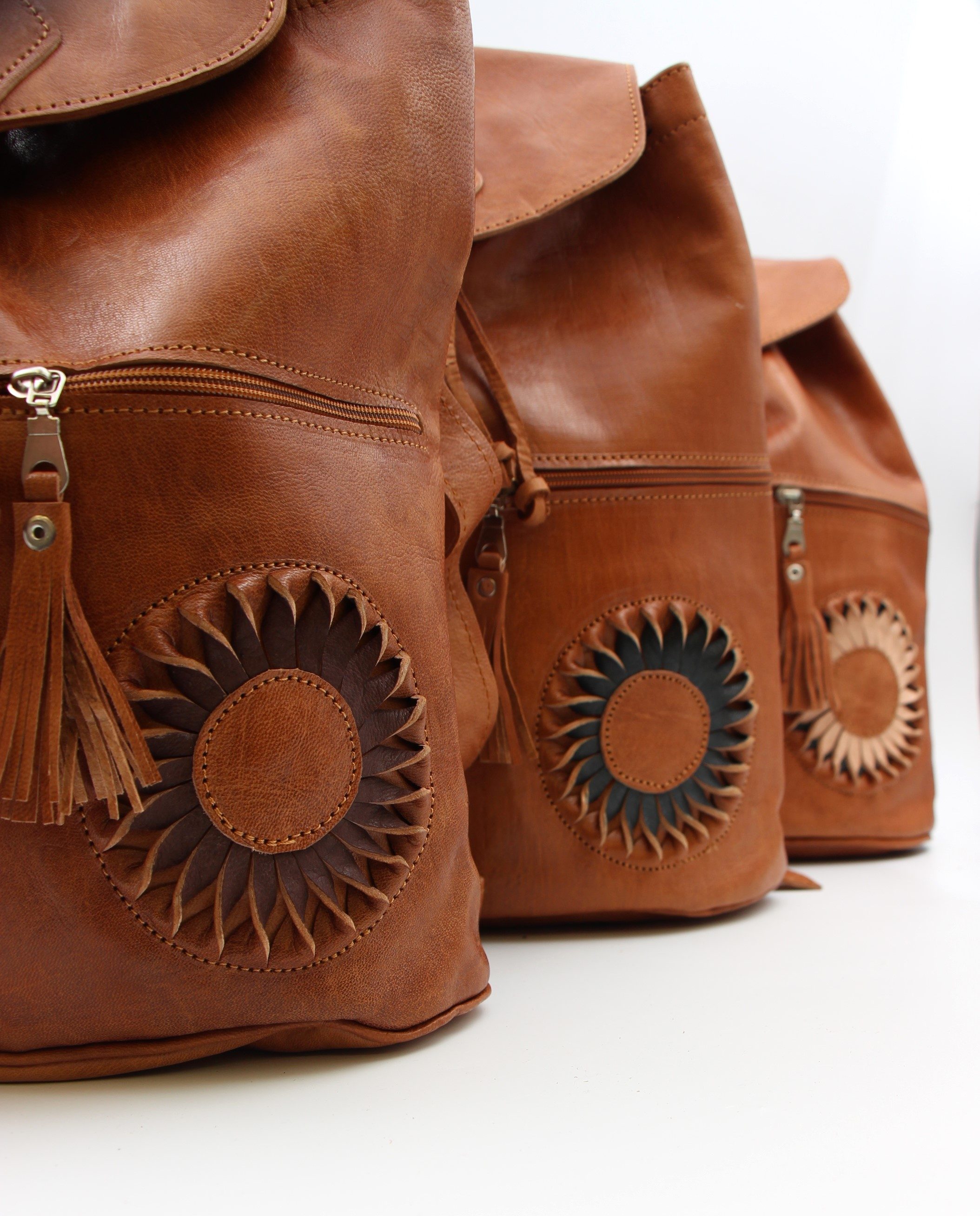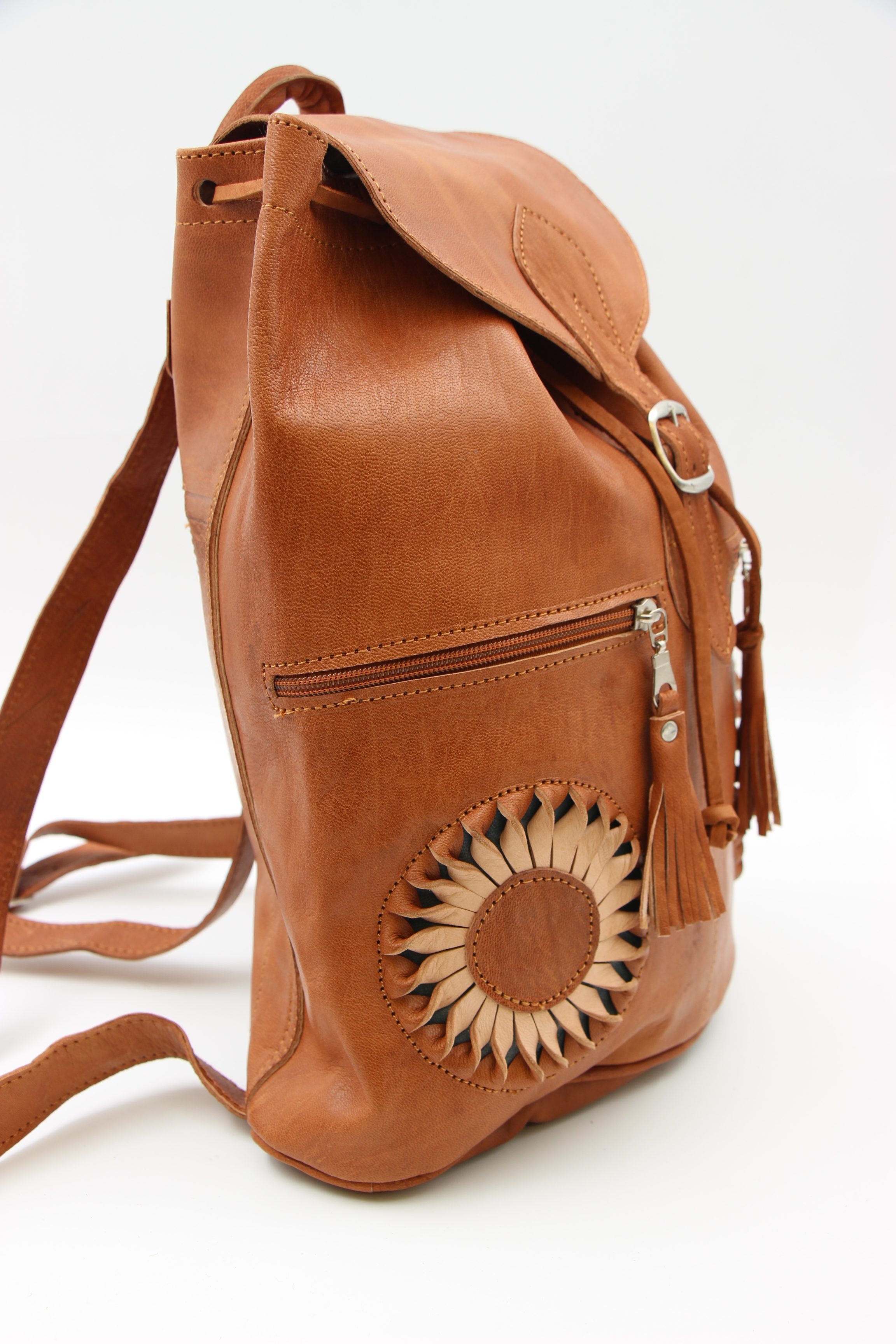 Genuine Moroccan Leather Back Pack – Tan With Cream/Tan 3D Sunflowers