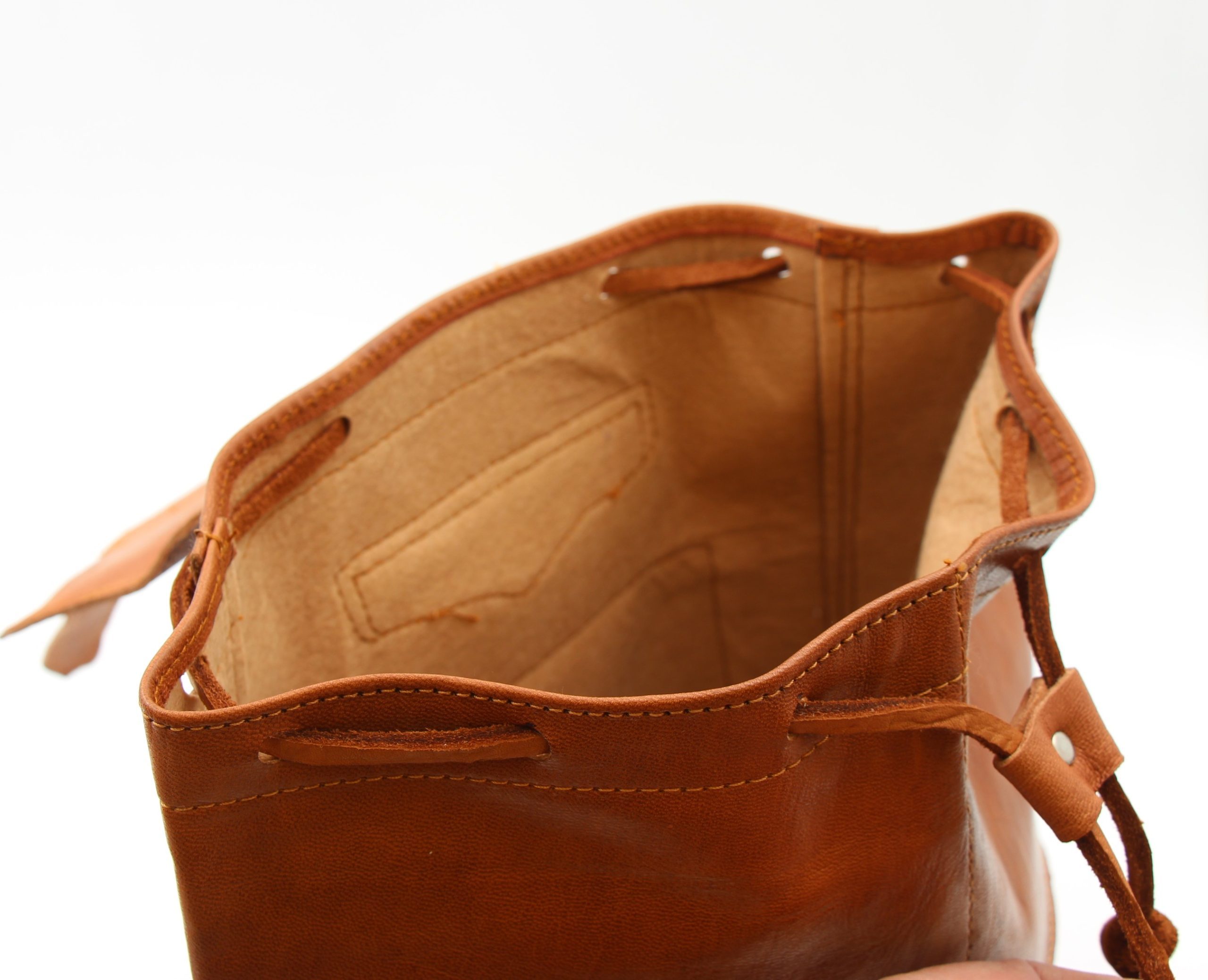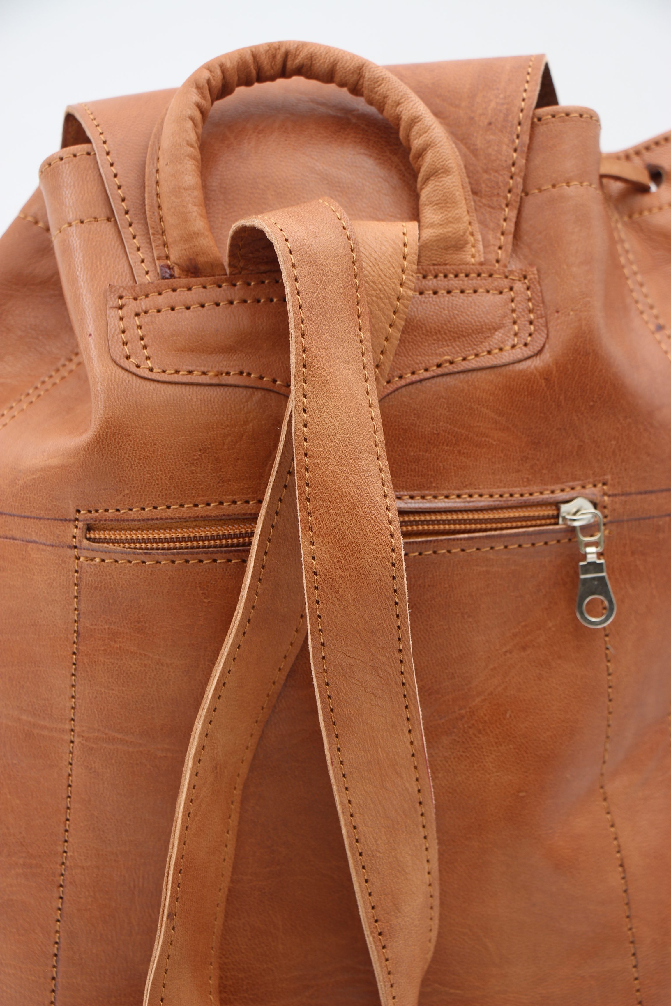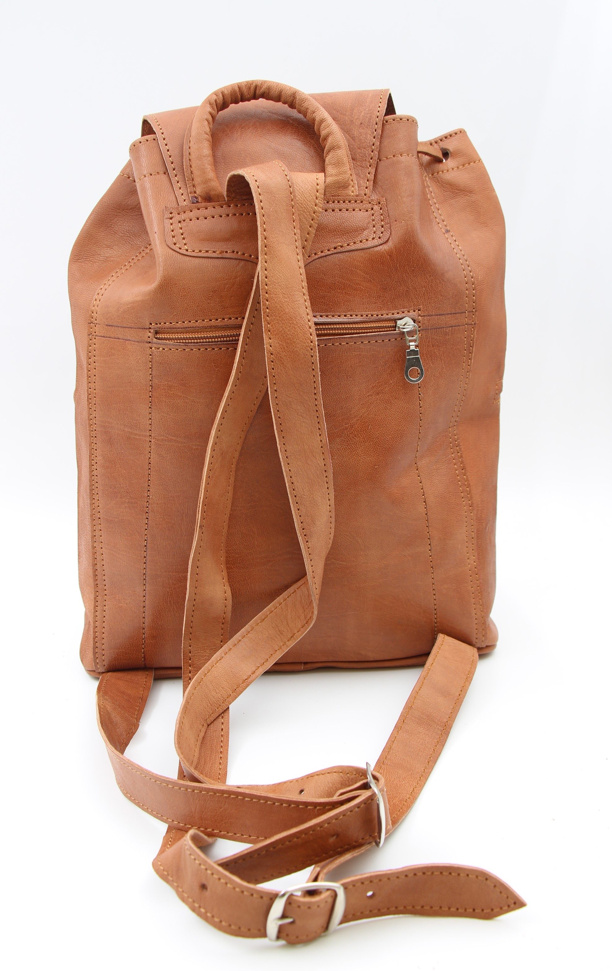 They have a soft fabric lining, Adjustable shoulder straps and a zipped pocket on the back. Also Two Zipped Pockets On The Front With Leather Tassels. The Backpack also has a drawstring to close the top