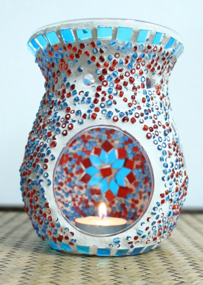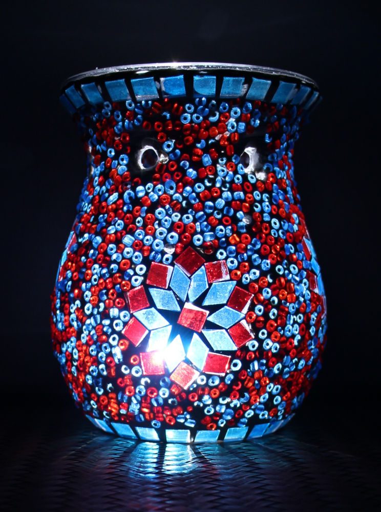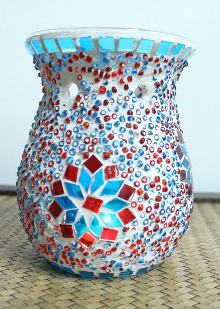 Turkish Mosaic Oil burner, available in 6 unique designs, light your candle, heat the oil, and let your senses relax in rich aromas and the play of light from your mosaic burner. This one is design 3 As all of our lamps are handmade there may be small variations. Approx. Dimensions 11 x 14 cm.