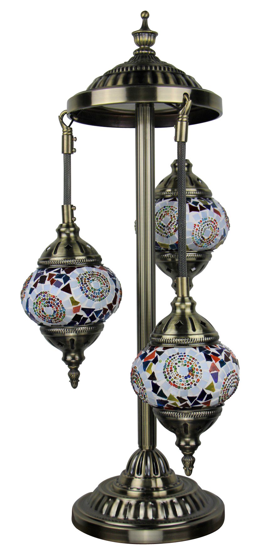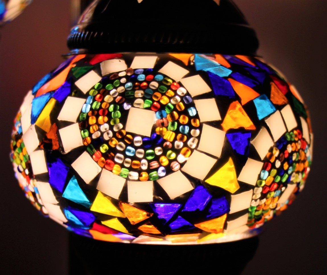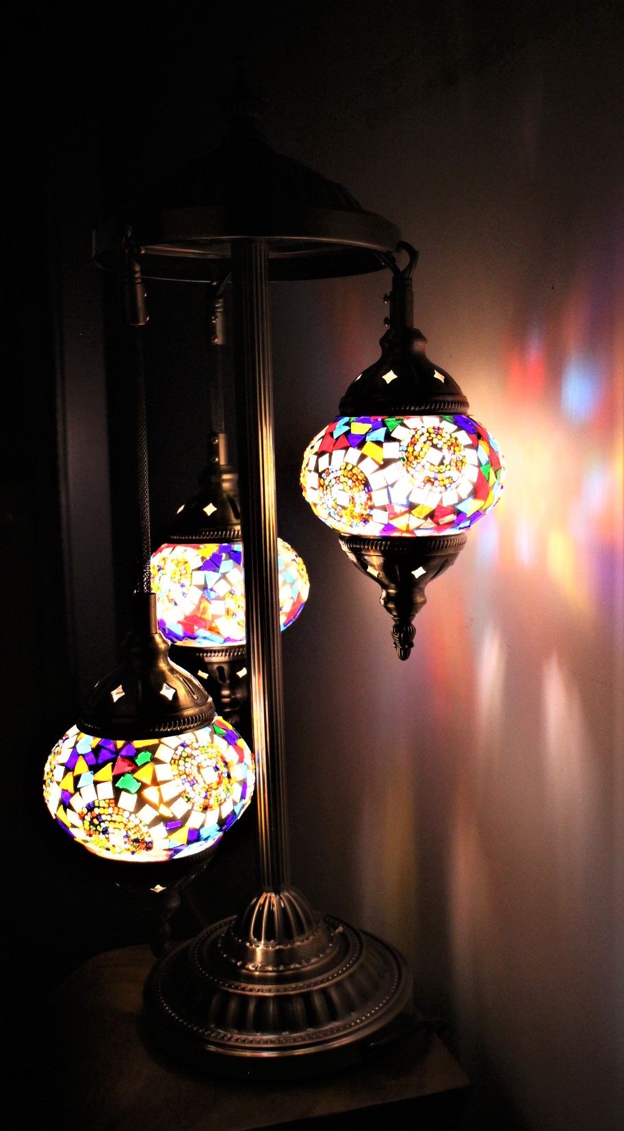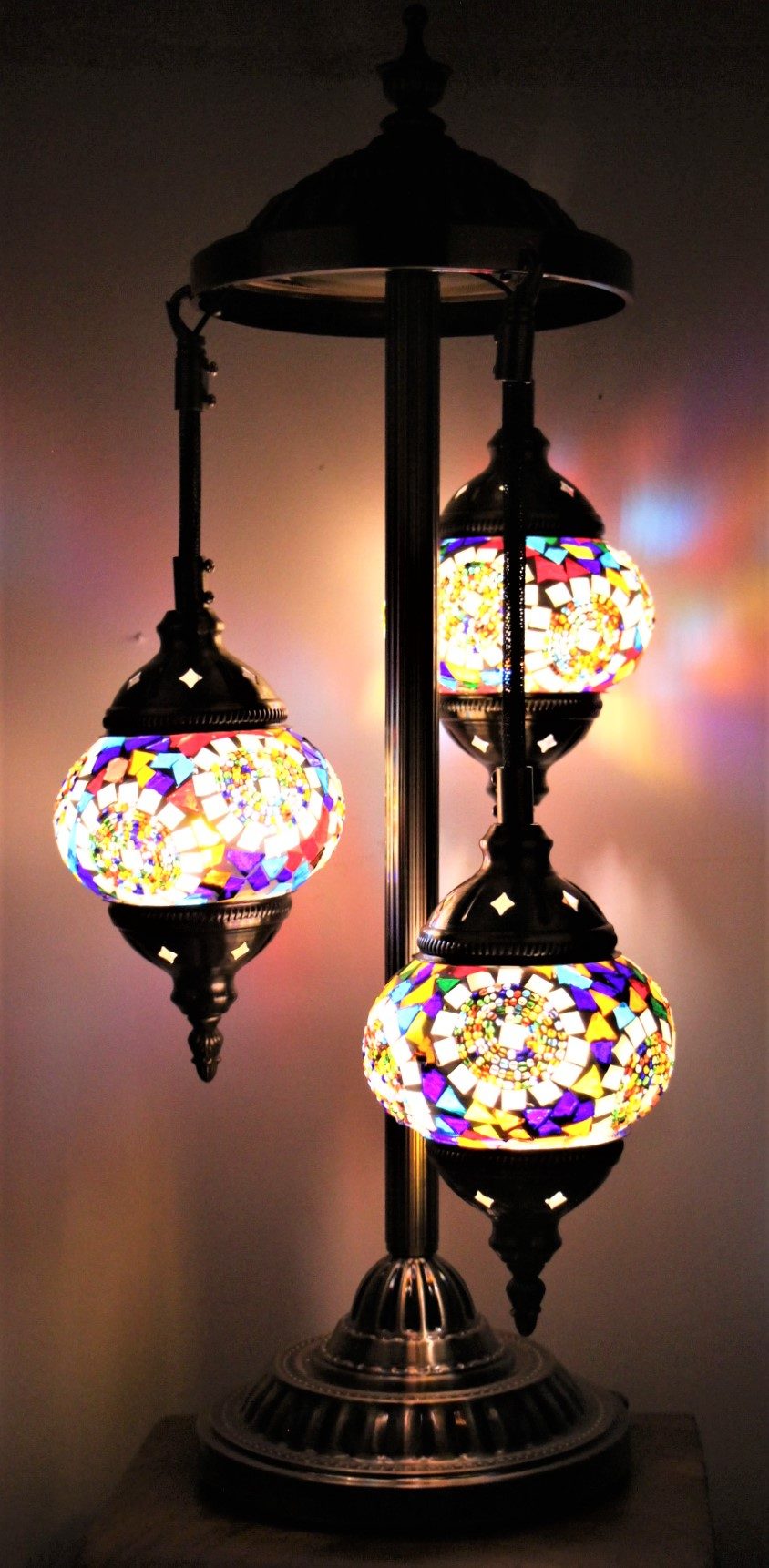 Turkish Mosaic Floor Lamp 3 globe Mosaic Moon Orbit. Simply awesome, bringing unique spheres of colour to your place. Fabulous in any room. Featured here is a Moon Orbit mosaic. As all of our lamps are handmade there may be small variations.Because all lamps have an on/off switch it makes it easy to turn the lamp off and on.. Approx. Dimensions 68cm high x 24cm wide x 24cm deep. Each globe is 14 cm.