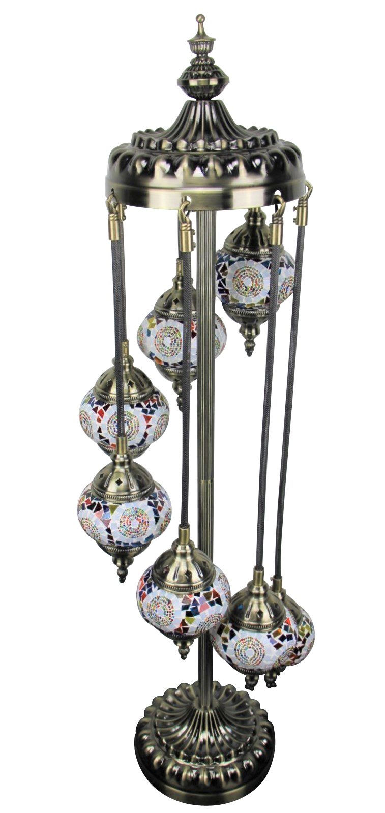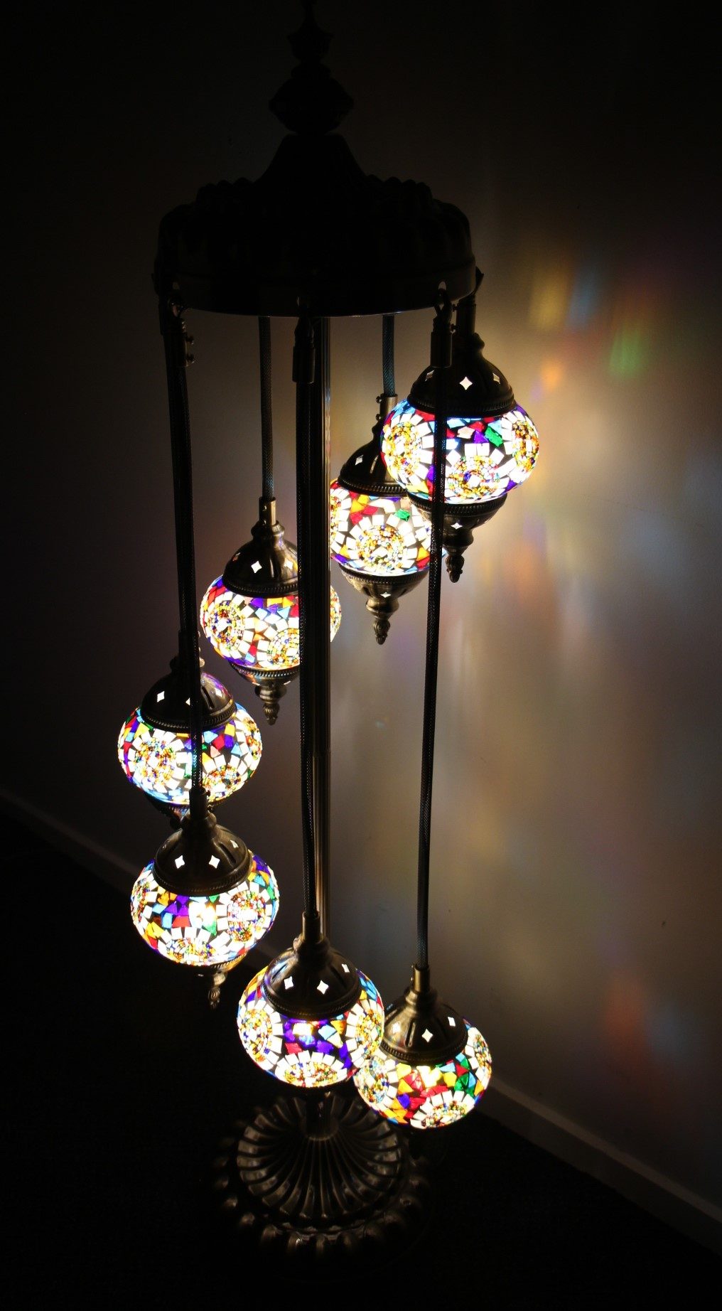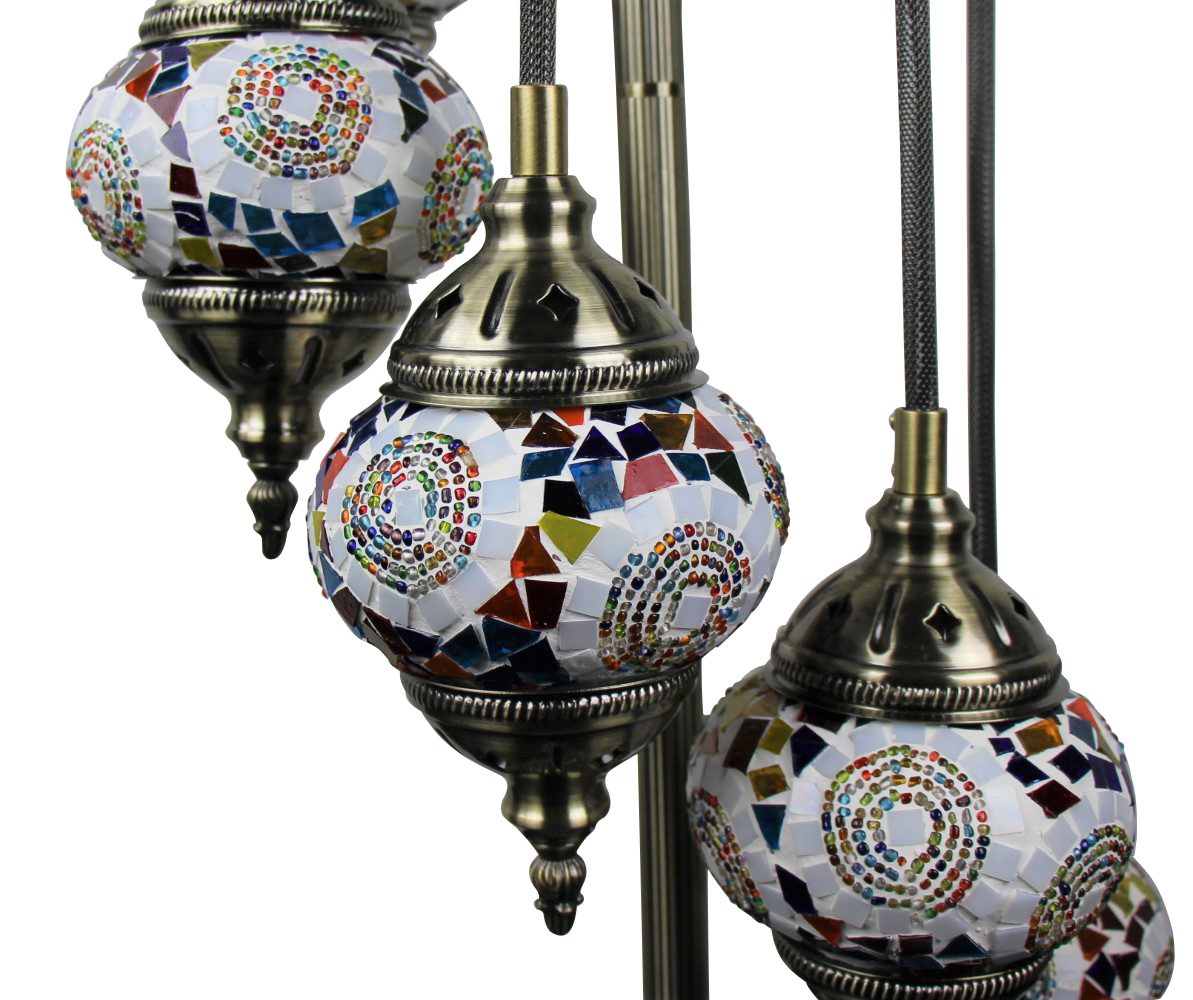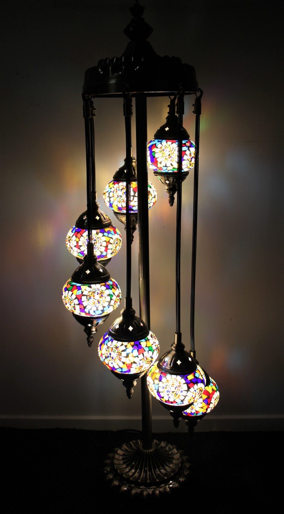 Turkish Mosaic Floor Lamp 7 Globe Mosaic Moon Orbit. Simply awesome, bringing unique spheres of colour to your place. Fabulous in any room. Featured here is a Moon Orbit mosaic. As all of our lamps are handmade there may be small variations. All lamps have an on/off switch. Approx. Dimensions 119cm High x 38cm wide x 38cm deep. Each globe is 14 cm.