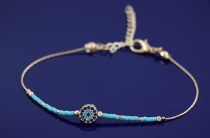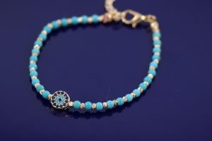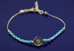 TURKISH EVIL EYE BRACELET WITH TEAL BEADS IN GOLD B115